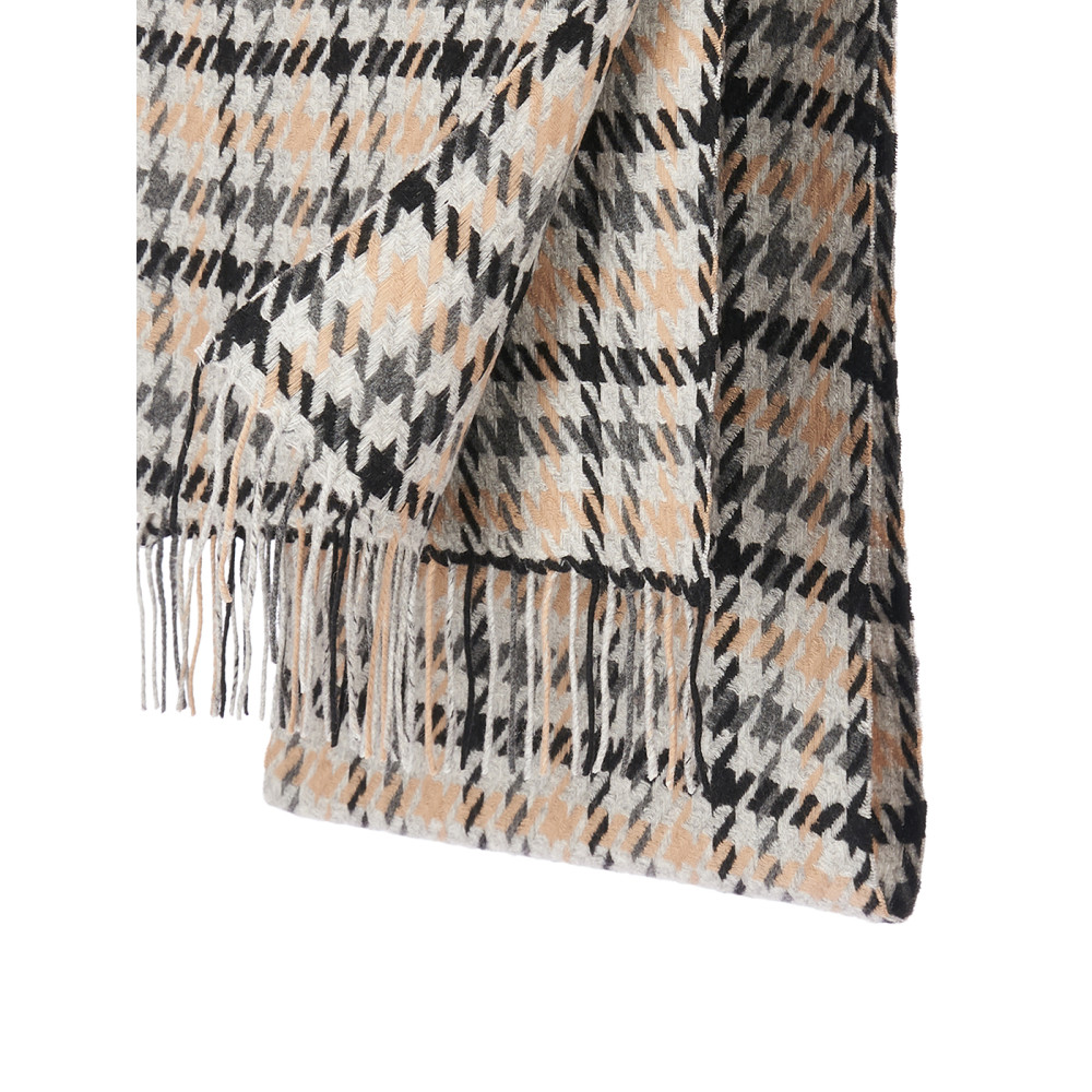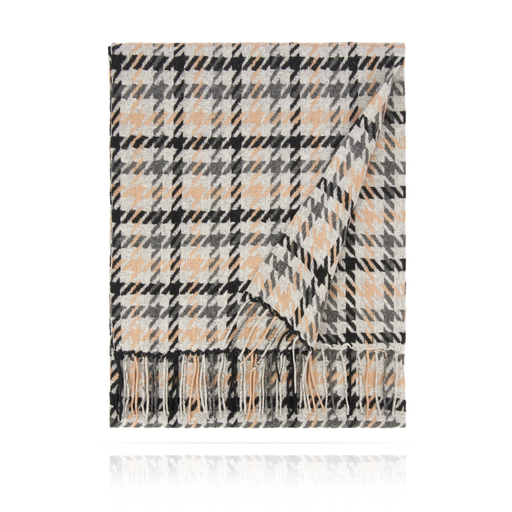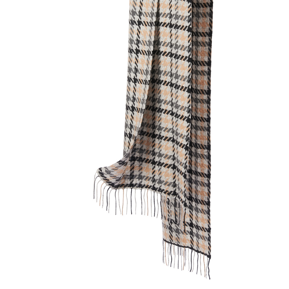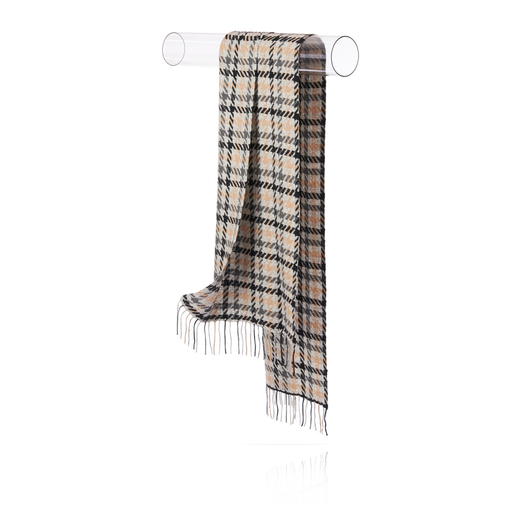 Мягчайшая шерсть Merinos, плетение Twill. Нежная в прикосновении шее, гладкая, достаточно плотная и отлично держащая форму ткань. Вес изделия 130г (220 г/м2). Крафтовая, вручную скрученная добротная бахрома. Раздельно окрашенная пряжа и нити позволили пол